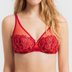 Goddess of fire, we offer the Burning Love scarf bra from Louisa Bracq. This avant-garde look features two-tone flame embroidery on the cup, complete with sheer tulle up to the straps. An exceptional choice when you're in the mood for something spicy.