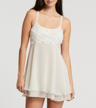 Embrace your feminine side with this ivory chemise. Adorned with delicate floral appliquées, this piece is both elegant and comfortable. The adjustable straps ensure the perfect fit, while the lightweight chiffon fabric provides a soft and airy feel. Fall in love with this beautiful addition to your sleepwear collection.
