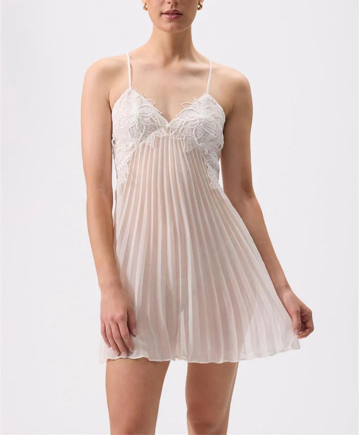 Experience elegance with The Rya Collection Delight Chemise, featuring delicate Venetian lace with scalloped edges and a flattering V neckline. The cascading accordion-pleated chiffon creates a light, airy silhouette, complemented by a sheer back that adds an alluring touch. Adjustable straps ensure a perfect fit, while the ethically made craftsmanship reflects conscious luxury. This chemise is the perfect blend of feminine grace and sophisticated style.