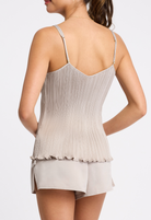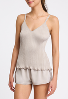 A chic neutral matching set, the Love Joy Cami-Tap set includes a pleated top and low-rise shorts. Bow details and adjustable straps add feminine touches to this perfect pair.