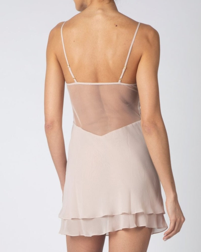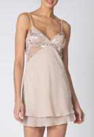 Slinky and soft, the classic Stunning chemise features sheer paneling and a diaphanous inset on back. Adorned in floral embroidery for bohemian flair! This chemise has a double ruffled hem for an extra dose of sweetness.