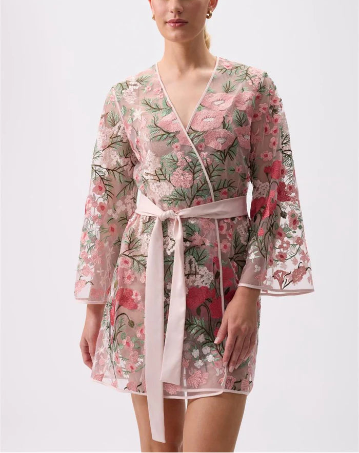 The Montelle Intimates Bouquet Coverup combines romantic embroidered netting in warm hues with a luxe charmeuse belt for a flattering wrap silhouette. Its V neckline and set-in sleeves add refined femininity, making it perfect to pair with a classic chemise or wear solo for an elegant date night. Ethically made and available in XS/S, M/L, and XL, this coverup blends sophisticated style with effortless grace.