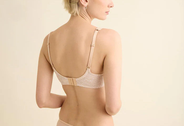 The Little Bra Company Jen bra combines delicate lace overlays with satin pleated details for a luxurious, feminine look. Designed with a deep plunge and underwire, it offers a light push-up effect that gently enhances and lifts, providing natural shape and comfort. Perfect for adding elegance to everyday wear or making special occasions extra memorable.