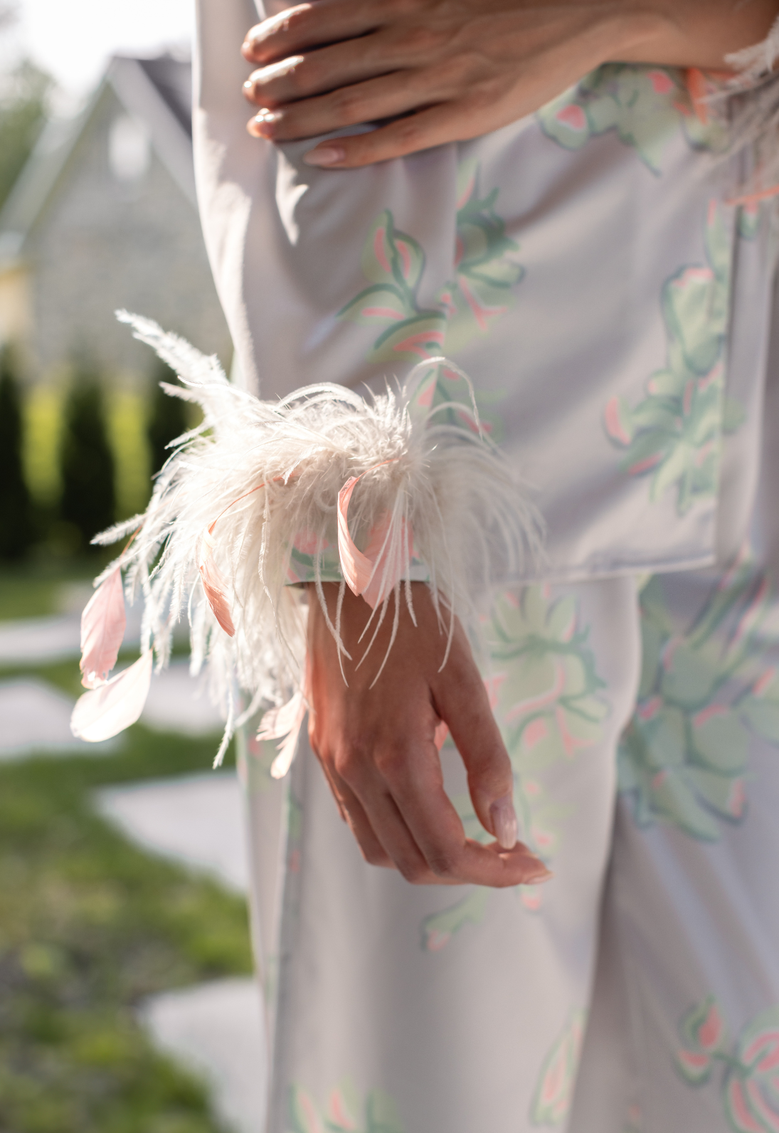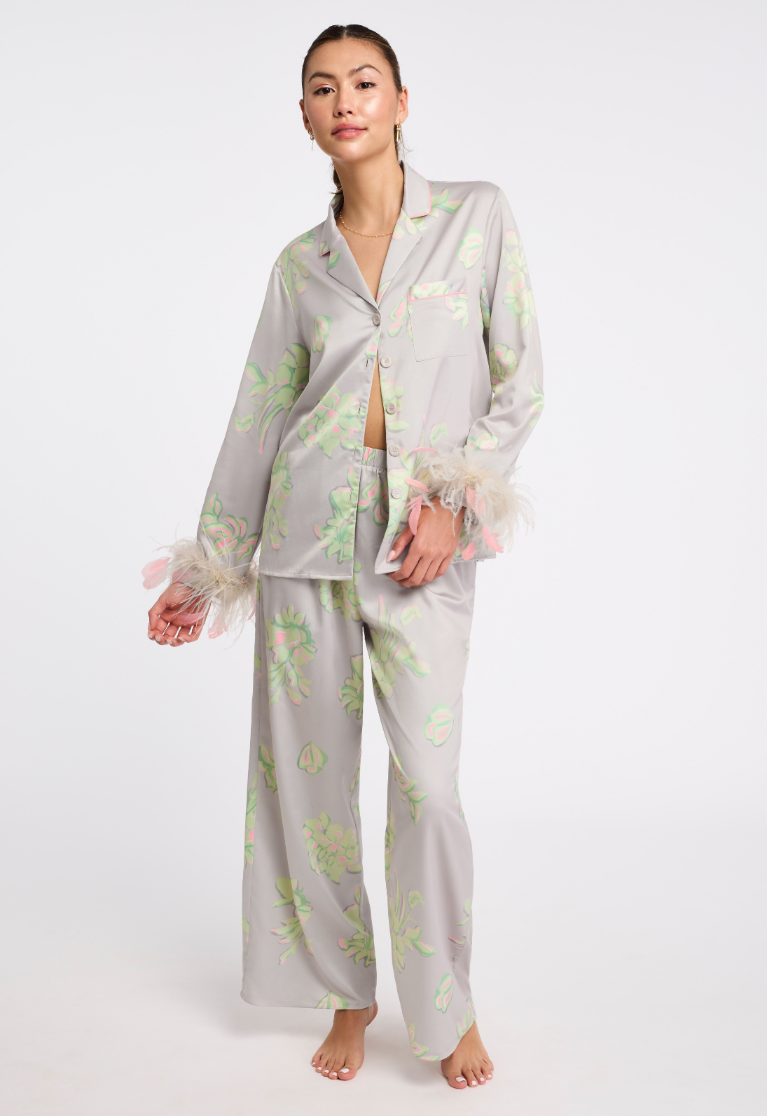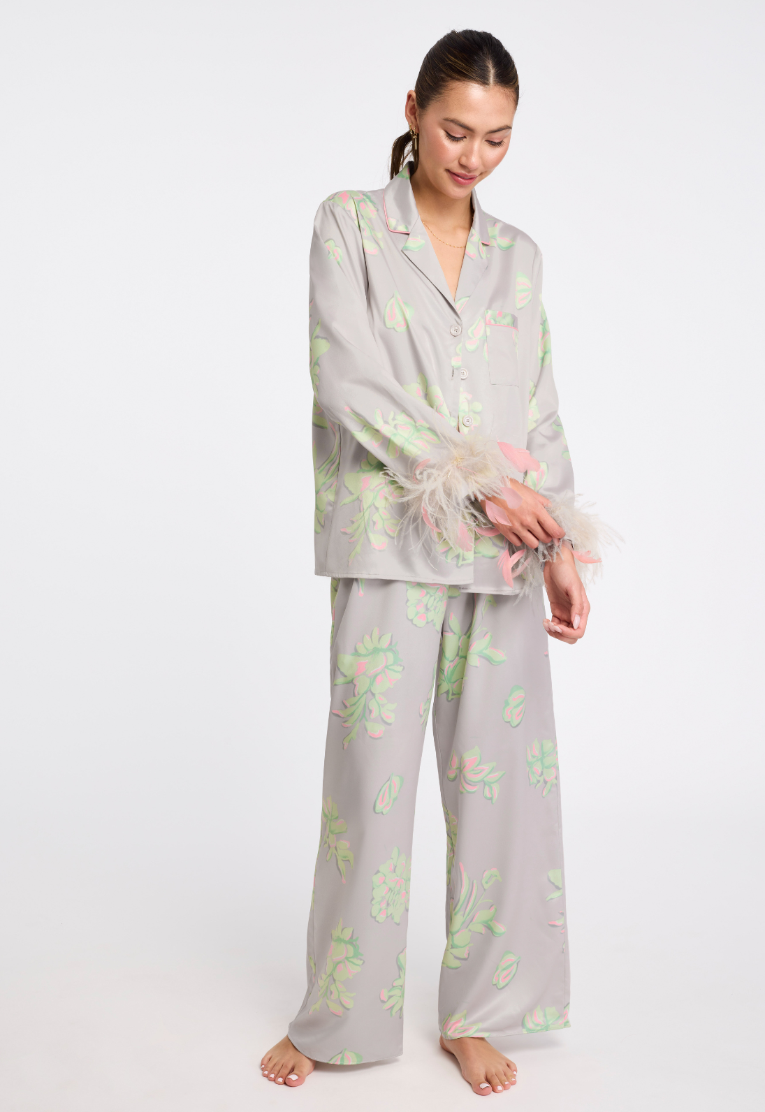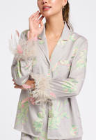 Mama said to always wear cute pajamas in case you meet the man of your dreams! The Sofia PJ set is a playful answer with a classic silhouette: button-down shirt and wide-leg pants. The ethically sourced feathers accent the cuffs and detach with a snap, if you choose. If you're bold enough, wear as an opulent matching set outside of the bedroom.